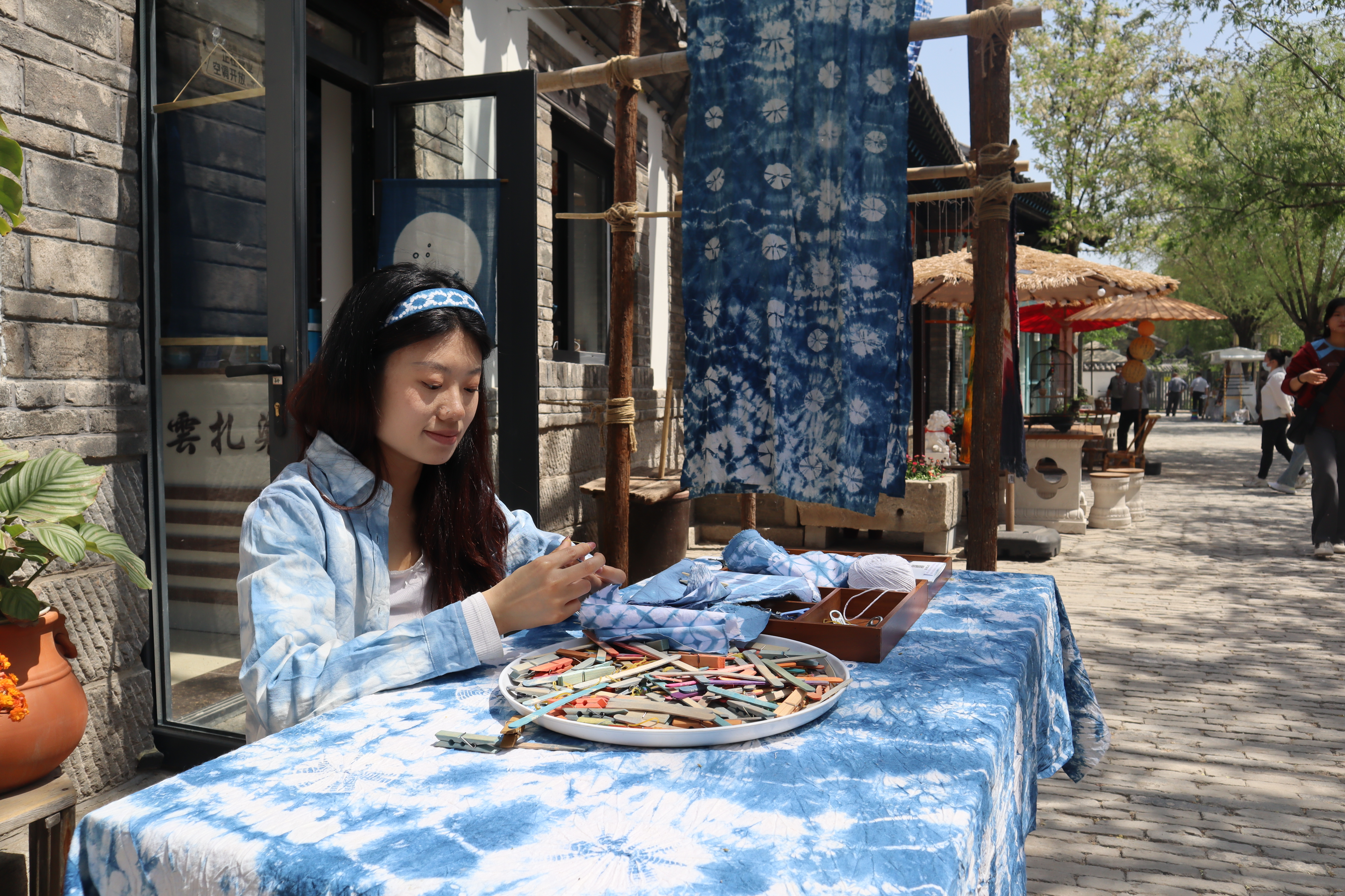 尚津济走在街区里,不由感慨业态全新升级后的百花洲给了非遗匠人一个更好的平台。扎染、掐丝珐琅、国画……一个个非遗工坊吸引着游人的目光。尤其是将作品挂在店外展示的扎染工坊,拍照打卡的游客排起了长队。非遗传承人韩作云看着眼前的场景,直言选择百花洲是个正确的决定。