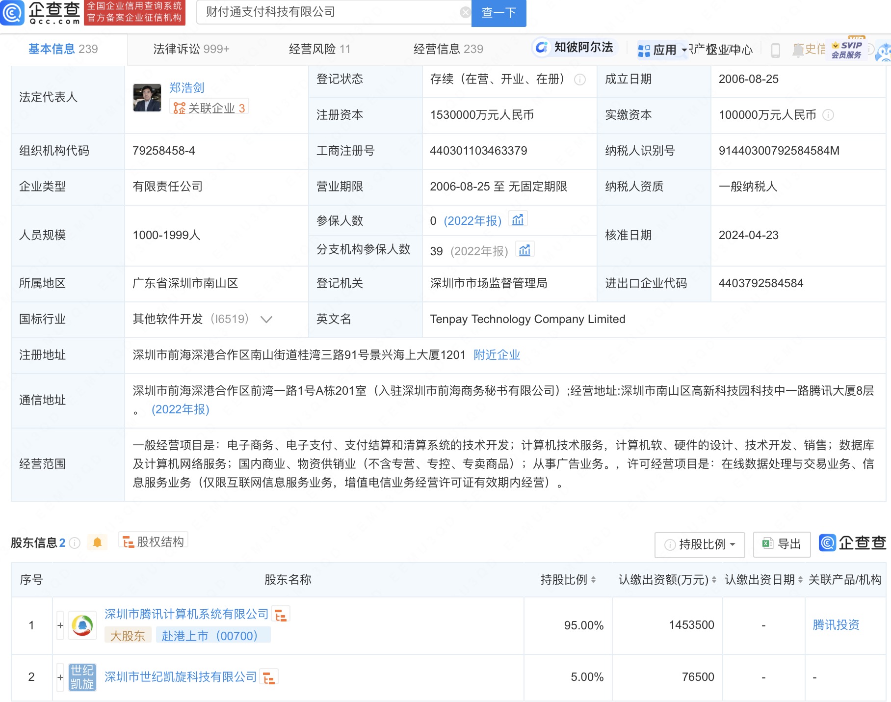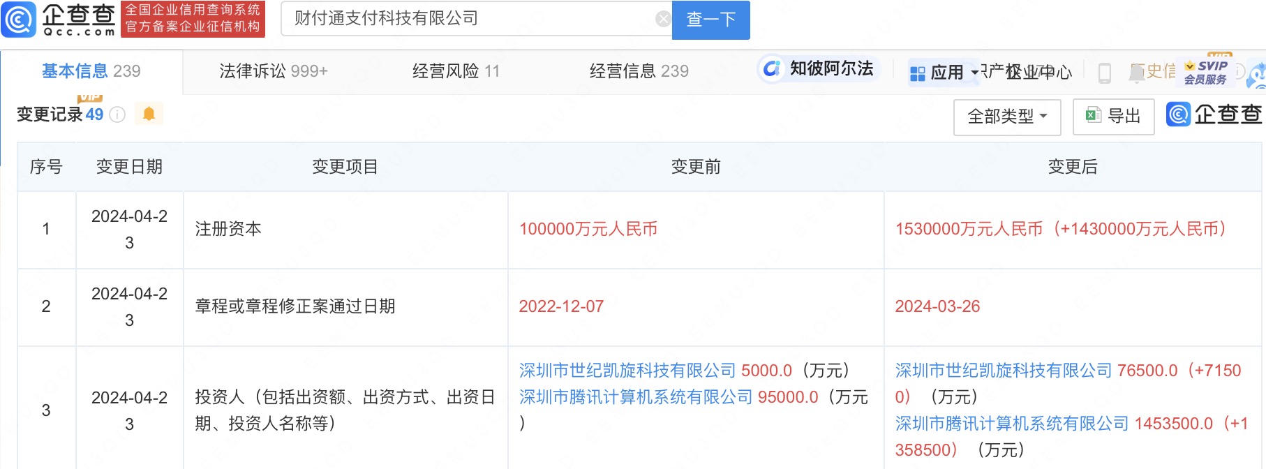 财付通增资完成工商变更 企查查 2024-04-24 1958 据企查查APP显示,近日,财付通支付科技有限公司发生工商变更,注册资本由10亿人民币增至153亿人民币。企查查信息显示,该公司成立于2006年,法定代表人为郑浩剑,经营范围含电子商务、电子支付、支付结算和清算系统的技术开发等,由深圳市腾讯计算机系统有限公司、深圳市世纪凯旋科技有限公司共同持股。 据媒体报道,今年3月,中国人民银行官网显示,同意财付通支付科技有限公司增加注册资本至153亿元人民币。 (企查查) 责任编辑:石卉