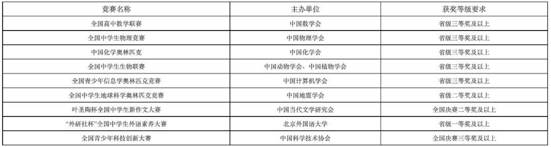 身心健康,品学兼优,通过2024年全国普通高等学校招生全国统一考试(夏季高考)报名,高中学业水平合格考试各科目合格,高中三年参加不少于10个工作日的社区服务和1周社会实践,并完成不少于6学分的考察探究活动(研究性学习、研学旅行、野外考察等),相关学科领域才能表现突出的普通高中毕业生, 同时满足报考条件之一: 1.高中阶段获省级及以上优秀学生或优秀学生干部表彰的。 2.高中阶段在以下竞赛中获得至少一项奖项的。