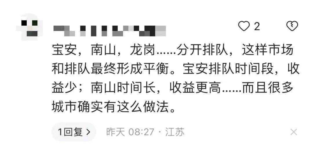 因此,该市民建议,可以参照上海、杭州机场的做法,将长短途乘客分流,当司机拉到宝安区乘客时,可以当场叫保安写个纸条给司机,司机送完乘客回到机场,凭纸条免排队拉乘客一次,这样会大大提升司机的服务水平和服务安全系数,更能体现深圳国际大都市对巡游出租车的人性化管理。