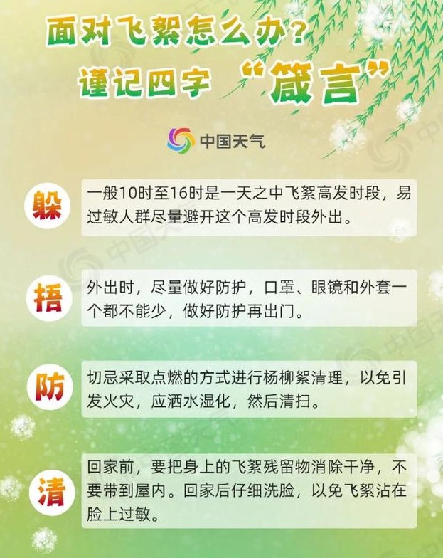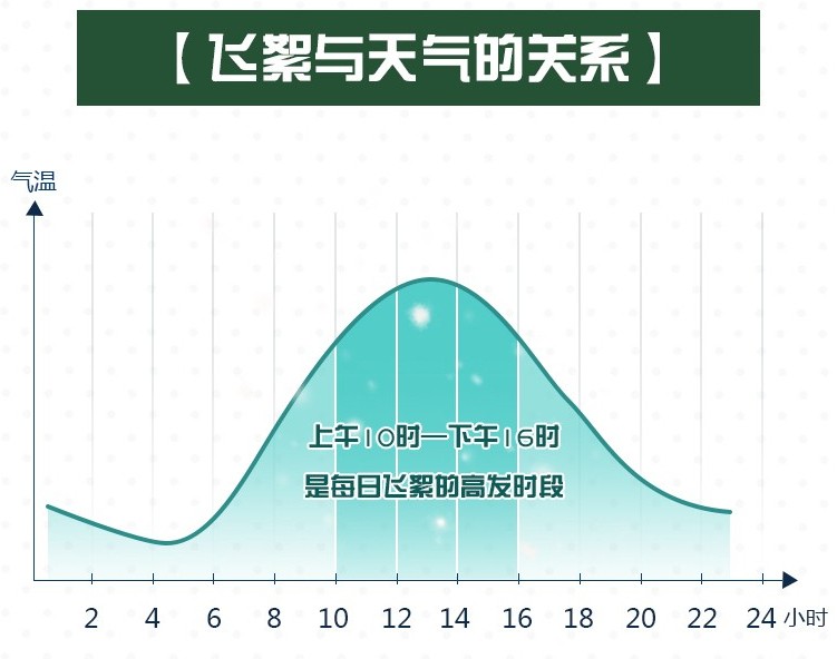 干燥、温暖、阳光充足的天气,有利于毛絮放飞自我。一般来说,每天上午10点到下午4点是飞絮的高发时段。