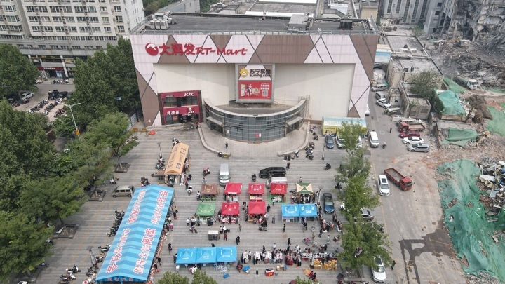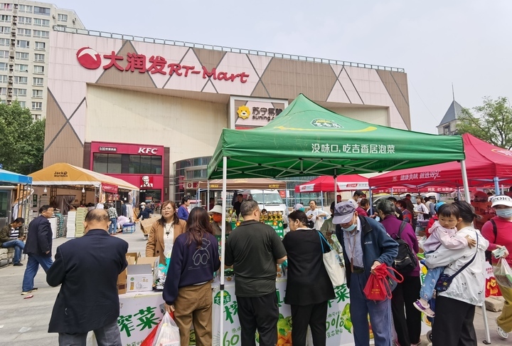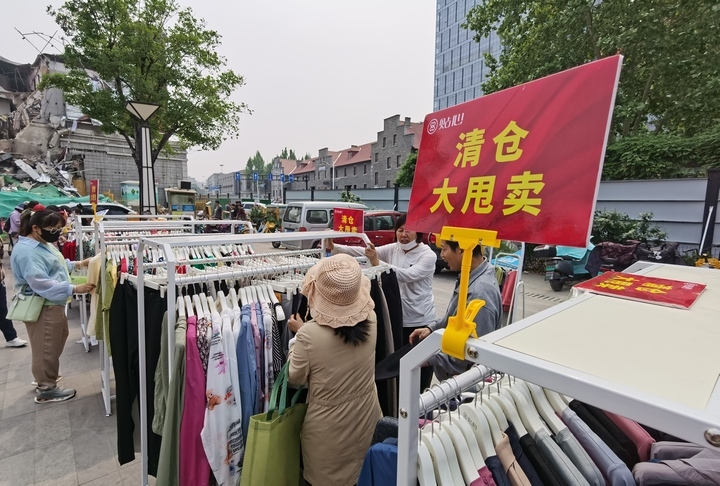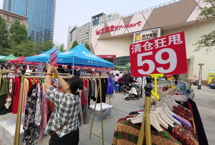 4月28日,在洪家楼大润发门店外,商家摆摊出售库存的商品,不少商家打出清仓甩卖的牌子,吸引了不少市民选购。