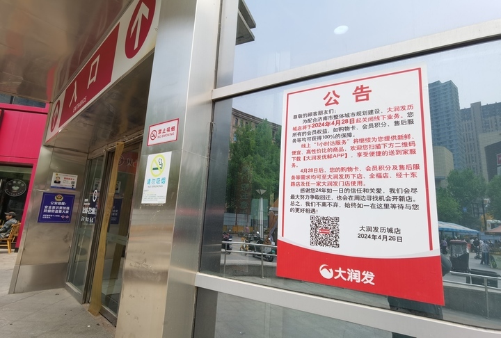 28日,曾是济南第一家、陪伴了济南市民24载的洪家楼大润发正式闭店。据大润发历城店发布公告显示,为配合济南市整体城市规划建设,大润发历城店将于2024年4月28日起关闭线下业务。会员权益,如购物卡、会员积分、售后服务等均可获得100%的保障。线上“1小时达服务”将继续提供新鲜、便宜、高性价比的商品。4月28日后,顾客的购物卡、会员积分及售后服务等需求均可至大润发历下店、全福店、经十东路店及任一家大润发门店使用。