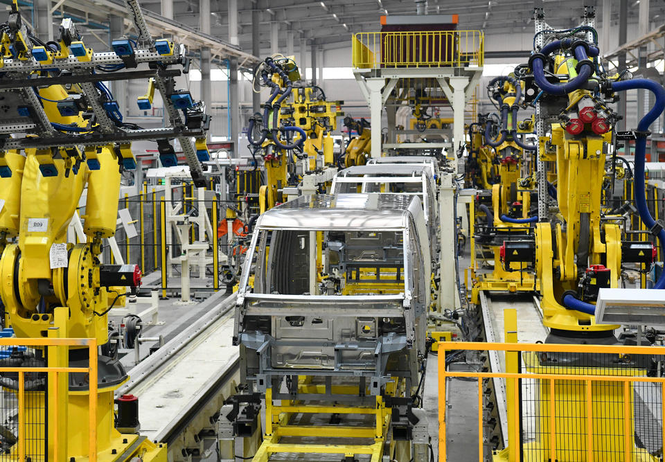 魏桥轻量化基地全铝车身集成生产线,机器人正在铆接全铝小物流车身