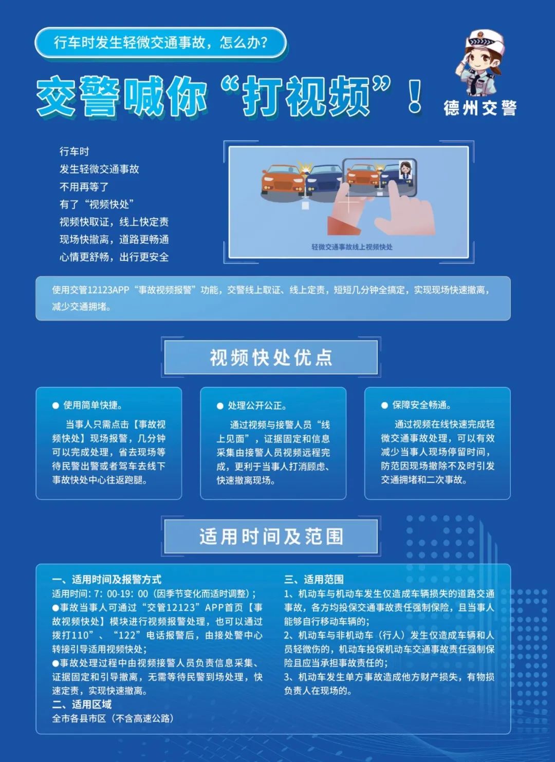 使用交管12123APP“事故视频报警”功能,交警线上取证、线上定责,短短几分钟全搞定,实现现场快速撤离,减少交通拥堵。