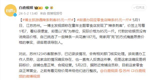 苏州市姑苏区市场监督管理局5月2日发布情况通报称,经核实,网上反映的情况基本属实。现场商品虽有明码标价,未违反有关价格法律法规,但不符合消费者对普通商品价格标识的认知。现已敦促店方整改,现场所售辣条已改为以包计价(按净含量价格从3元到15元不等)。