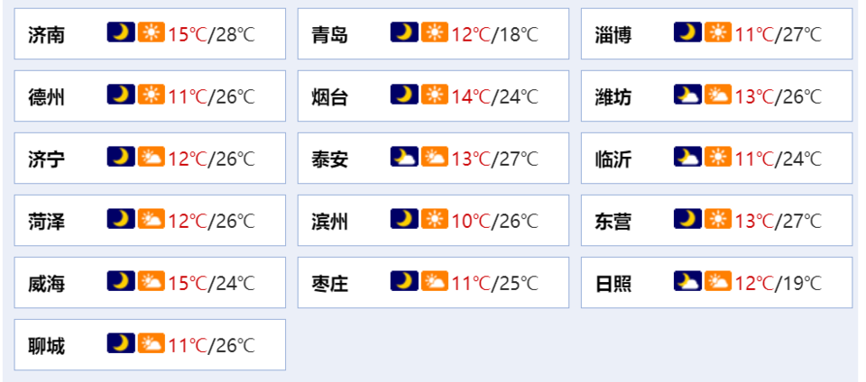 最低气温:临沂、日照和半岛内陆地区10℃左右,其他地区12℃左右。