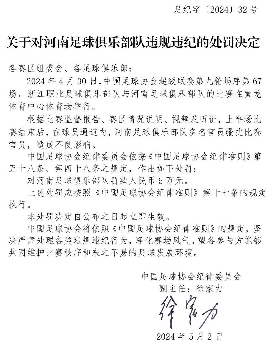 中国足协:河南队因骚扰比赛官员被罚款5万元