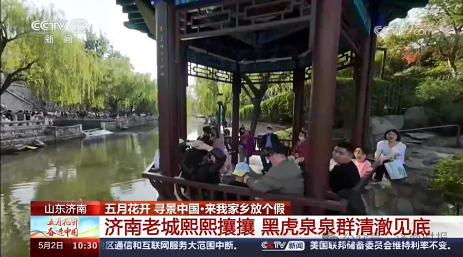 5月2日上午,中央广播电视总台推出“五一”特别栏目《来我家乡放个假》,并在央视综合频道和新闻频道并机直播,全面呈现火热的“五一”旅游盛况。济南作为山东省内唯一城市亮相央视,在黑虎泉与护城河畔CityWalk,以空中、地面和水下的多维视角,全方位呈现假日泉城的独特魅力。