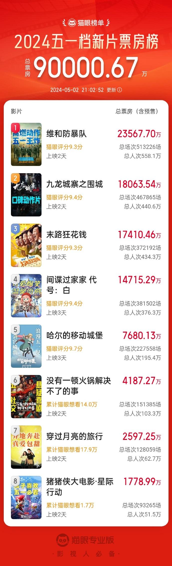 据猫眼专业版数据,截至5月2日21时2分,2024年五一档新片总票房(含预售)超9亿元。《维和防暴队》《九龙城寨之围城》《末路狂花钱》分列票房榜前三位。