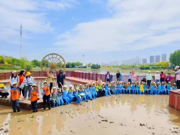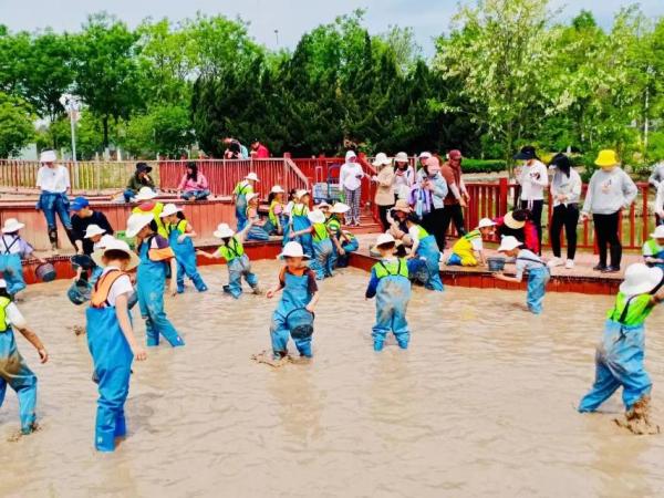 正午时分,小站练兵园的研学基地里热闹非凡,在研学团队生动的科普讲解及有趣的实操指导下,小朋友们化身“小农人”,将一颗颗秧苗插进田地里,泥浆沾满了孩子们的双手和双脚,弄脏了衣服,但是大家仍兴致高昂,一边干得热火朝天,一边憧憬着秋天的收成。