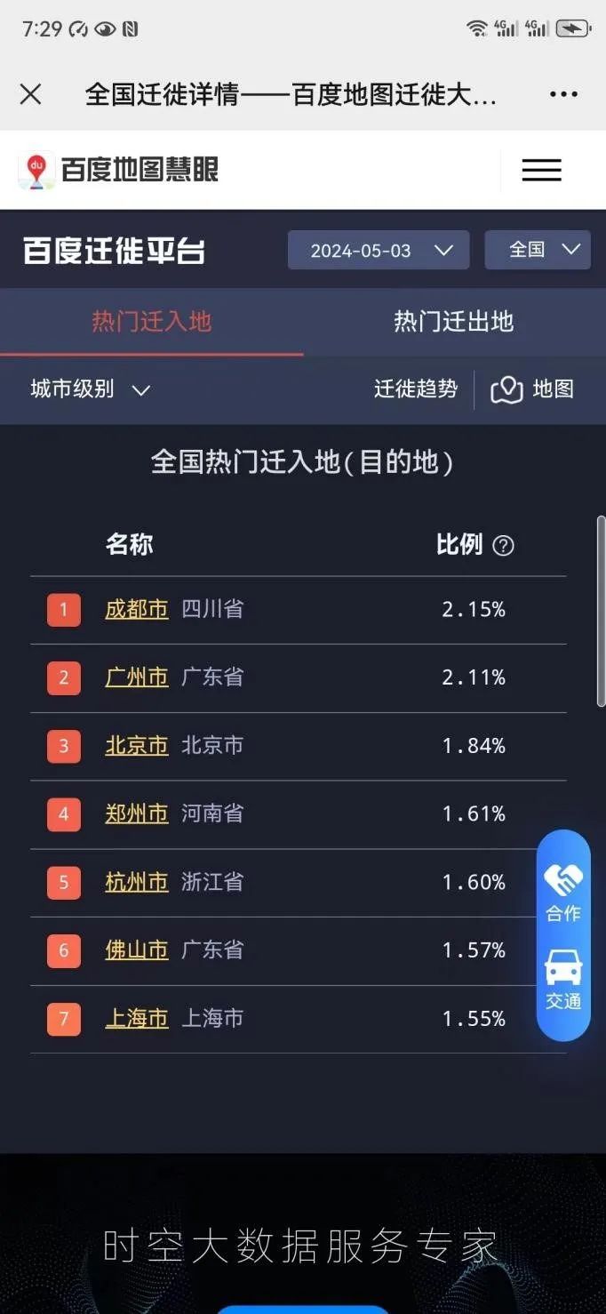 据百度地图迁徙大数据平台数据显示 ,5月3日,郑州位列全国热门迁入地(目的地)第四位,(前三位是成都、广州、北京)。5月4日,郑州位列第六位。