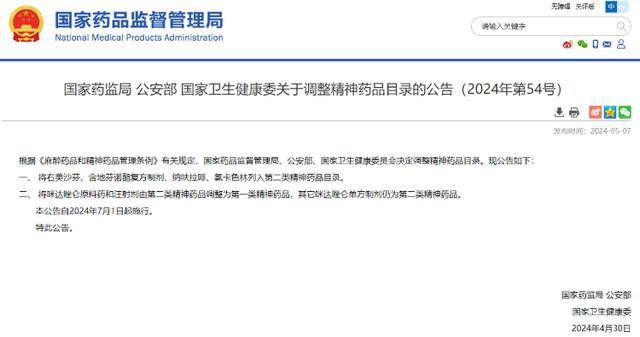 5月7日,国家药监局网站公布国家药品监督管理局等三部门关于调整精神药品目录的公告。