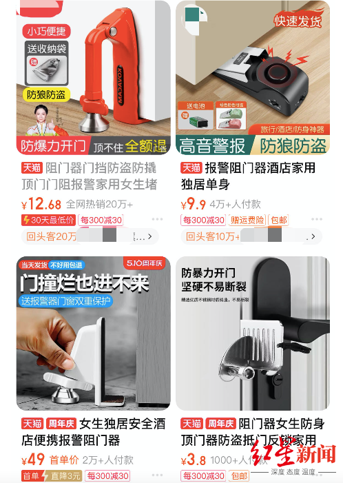 红星新闻搜索发现,近年来媒体多次报道客人入住酒店“被开门”的消息。酒店房卡管理问题频发,引发了很多人特别是单身女性对出行安全的担忧。在电商平台上,标注“单身女性”“酒店安全”的阻门器热销,畅销款销售过20万件。
