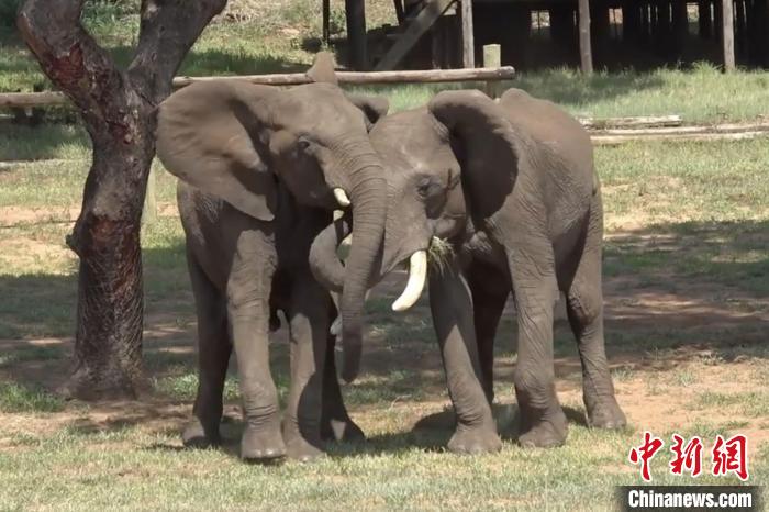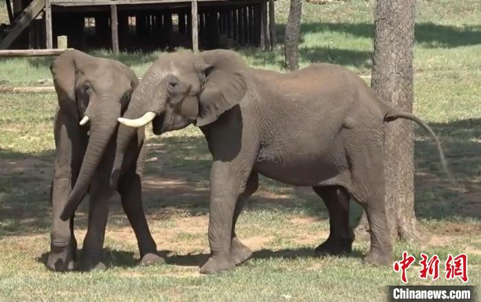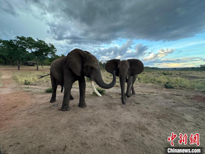 非洲象多玛(雄性)和马伊诺斯(雄性)打招呼,它们互相揉蹭头部(图片来自Vesta Eleuteri)。施普林格·自然/供图