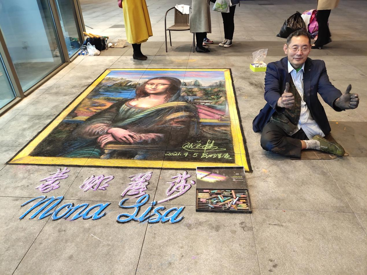 一位中年大叔匍匐在地上专心用粉笔绘画,三四个小时后,一幅世界名画《蒙娜丽莎》在地面上露出与世界名画一样的神秘笑容。