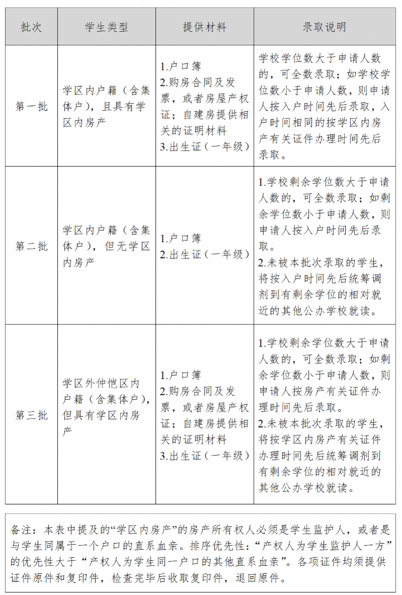 公办学校招收区内户籍新生,按照批次先后顺序录取,具体批次如下:
