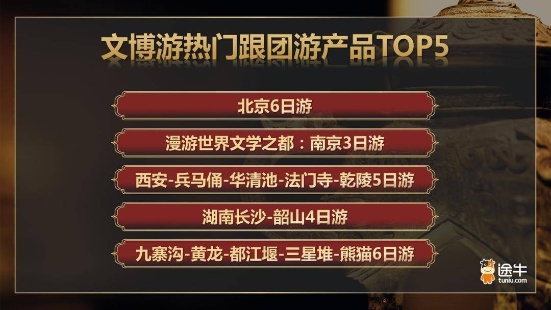 此外,在途牛热门跟团游产品预订中,如“北京6日游”“漫游世界文学之都:南京3日游”“西安-兵马俑-华清池-法门寺-乾陵5日”“湖南长沙-韶山4日游”“九寨沟-黄龙-都江堰-三星堆-熊猫6日”等包含博物馆行程的线路同样是相关目的地跟团游产品中的热门首选。