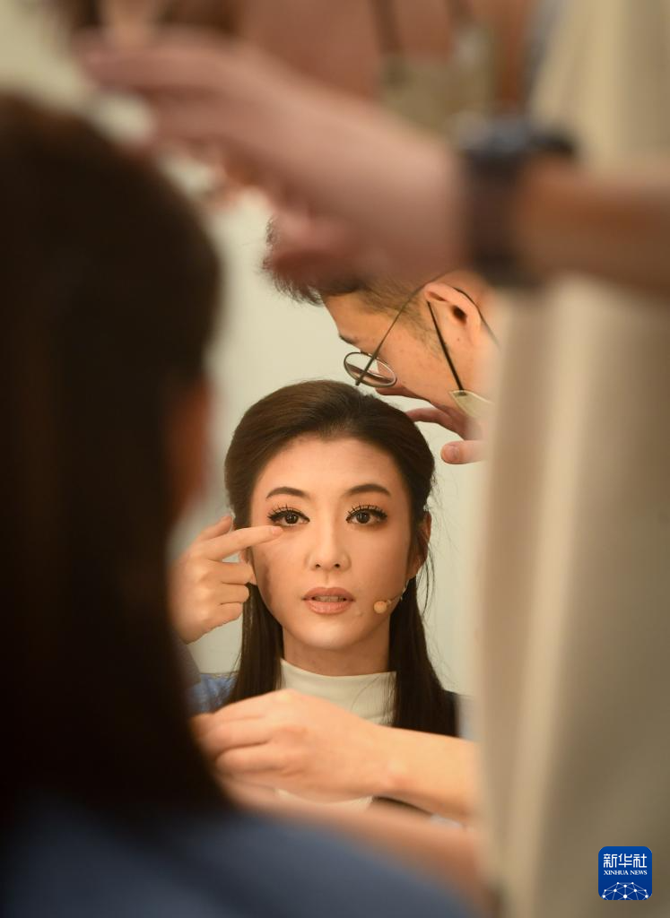 2024年5月1日,参演新编现代戏《钱塘里》的演员在杭州蝴蝶剧场的化妆间上妆。新华社记者 翁忻旸 摄