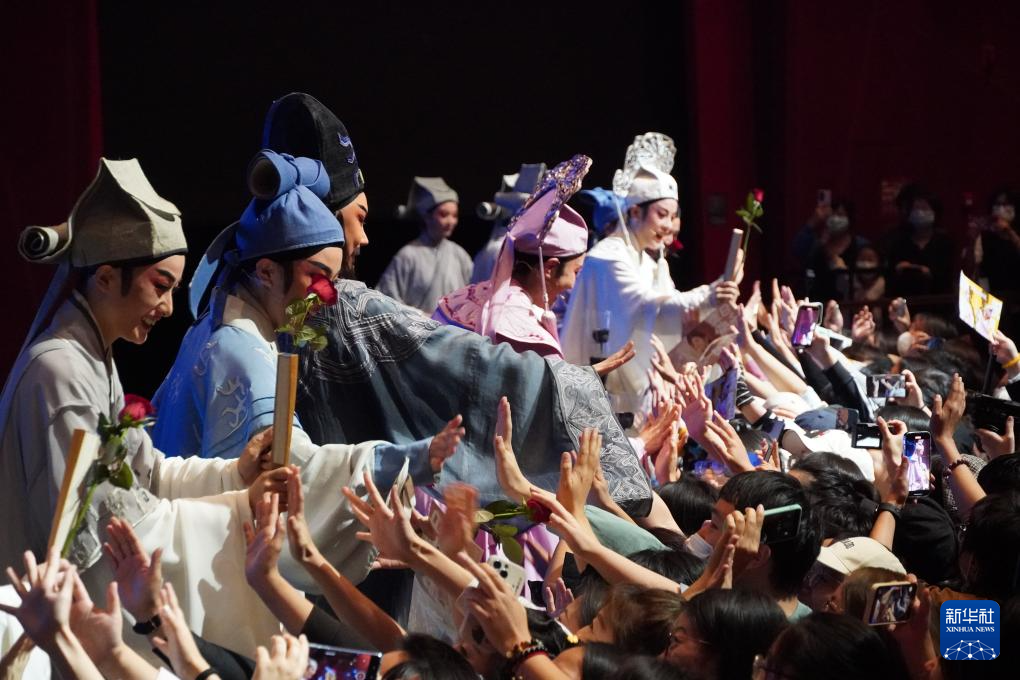 在杭州蝴蝶剧场,浙江小百花越剧院的演员在新版《梁祝》(青春版)演出后和观众互动(2023年10月25日摄)。新华社发(百越文化创意有限公司供图)