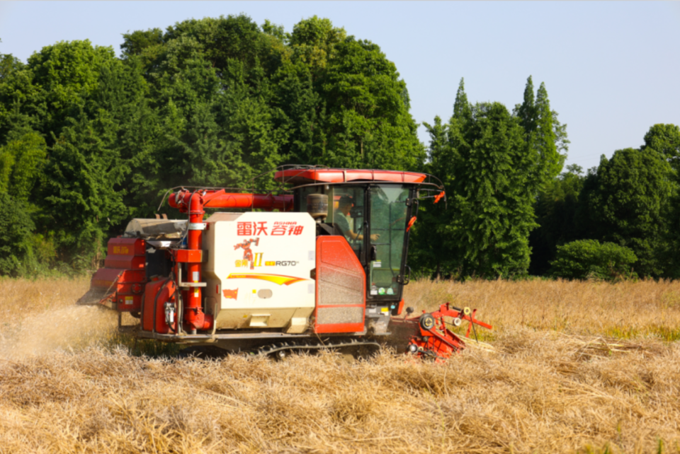 5月14日,都江堰市天马镇二郎村的油菜田里,当地农机手吴先生驾驶雷沃谷神RG70金刚二代履带机驶入油菜田,来回穿梭之间,一串串饱满的油菜荚被卷入机器,快速完成脱粒,油菜果壳和秸秆被碾成碎片,直接抛撒还田育肥地力。