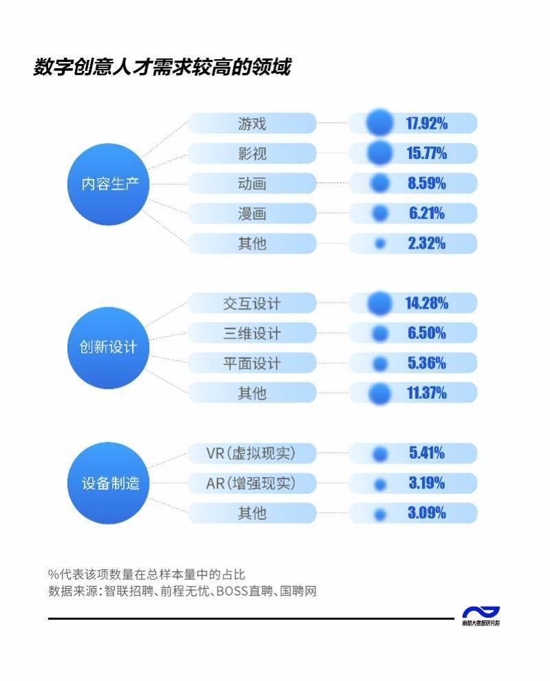 从南都大数据研究院采集的招聘岗位数据来看,内容生产是数字创意人才需求最大的领域,占比超五成。其中又以游戏和影视行业最为火热,分别占比17.92%和15.77%。其次,当前交互设计相关人才的需求量也很大,占比14.28%。随着用户审美水平及个性化需求的提高,对数字创意产业的产品和服务提出了更高的要求。