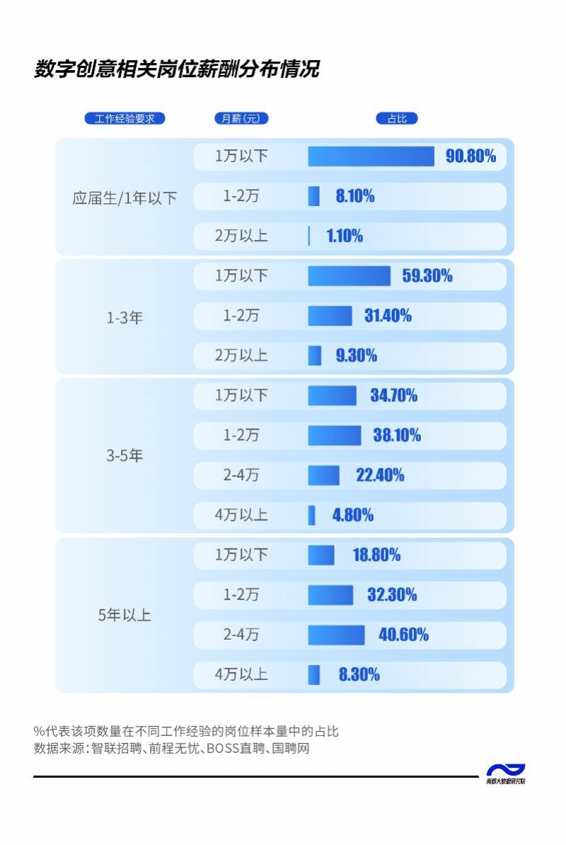数字创意人才的薪酬如何?梳理发现,应届生或工作经验在1年以下的岗位中,超九成月薪在万元以下,但随着工作年限提升和经验增加,行业平均薪酬不断上涨。要求工作经验在5年以上的岗位中,超四成开出2万-4万元月薪,8.3%的岗位月薪更是在4万元以上。