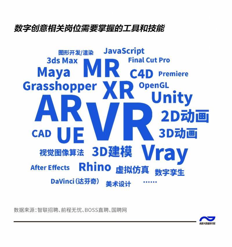 此外,作为依托现代数字技术发展的新兴产业,各类数字工具成为数字创意相关岗位技能要求的高频关键词。Unity、UE(虚幻引擎)、Maya、Grasshopper、V-Ray等软件和引擎工具在招聘岗位需求中频频出现。