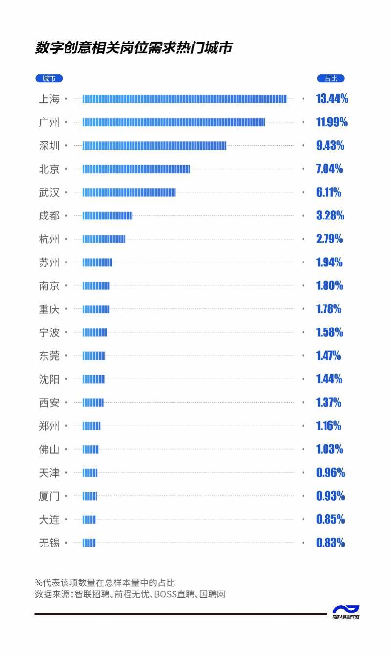 从城市分布来看,数字创意相关岗位呈现向一线、新一线城市集中的趋势。具体来看,位于上海的数字创意相关招聘岗位数量最多,占比13.44%;其次是广州,占11.99%;深圳、北京、武汉的招聘岗位数量占比均超6%。