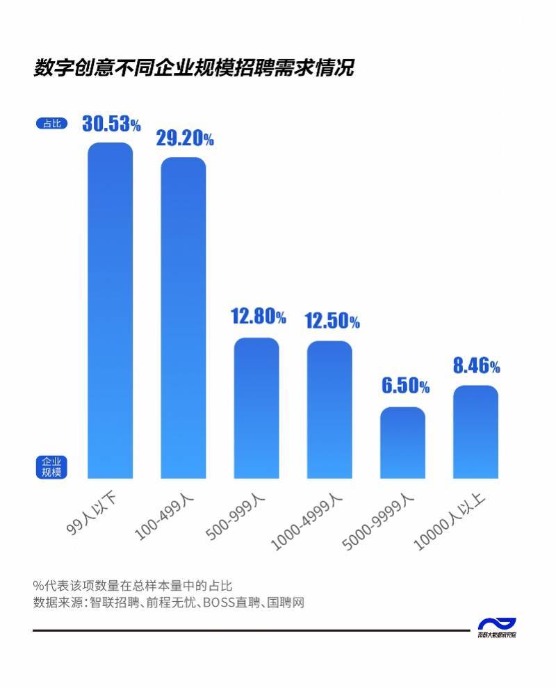 从企业规模来看,中小企业是数字创意人才的招聘主力军。超三成数字创意相关岗位招聘信息来自员工人数99人以下企业,100-499人企业招聘岗位数量占比29.20%,员工数量在10000人以上的行业巨头对数字创意人才的招聘需求占比8.46%。