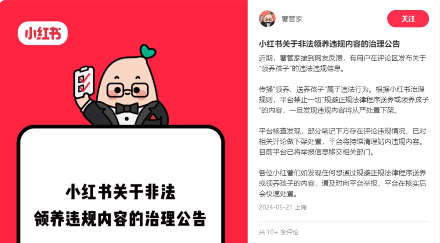小红书发布治理公告:平台禁止一切“规避正规法律程序送养或领养孩子”的内容