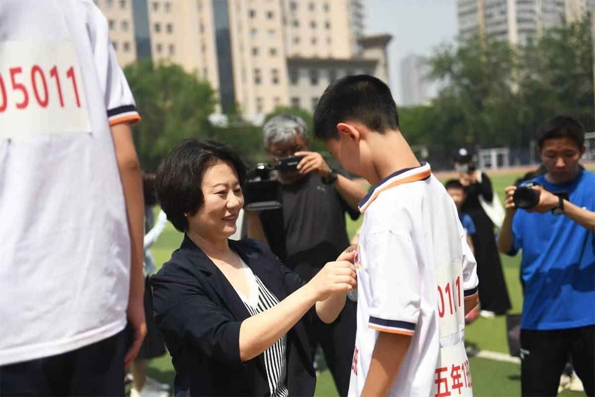 随着最后一项4×100米接力赛事结束,运动员们在本届运动会上的比赛也尘埃落定,岳小校长褚新红为获奖运动员颁发奖牌,并向他们表示祝贺,鼓励同学们发扬体育精神,奋勇争先。至此,岳小全员运动会也画上了圆满句号。