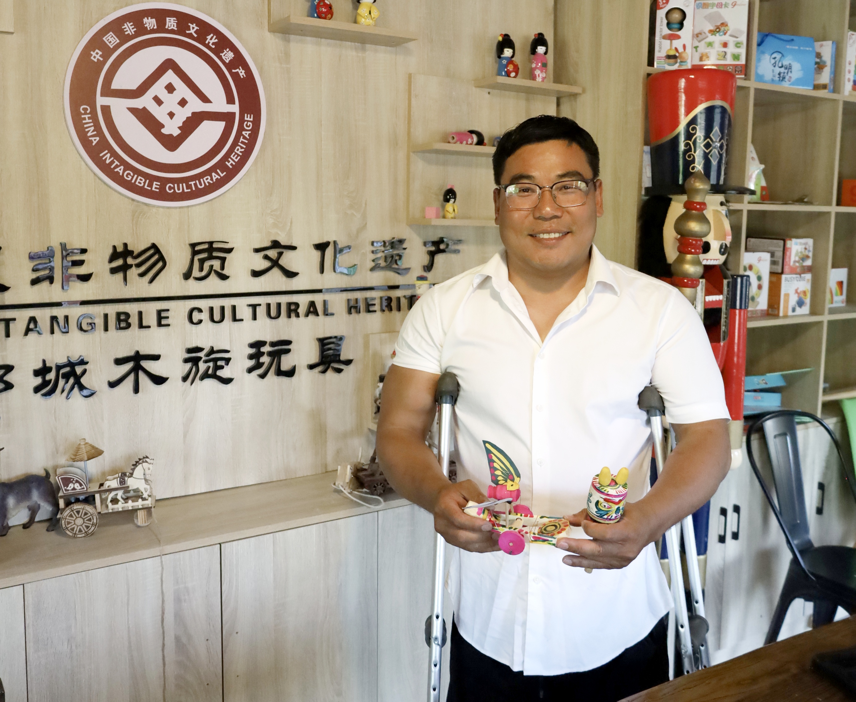 这家公司的当家人叫樊森。许多人不知道的是,樊森自小双腿残疾,行走全靠双拐,但凭着一股不服输和敢闯敢拼的劲儿,他不仅成为了郯城木旋玩具第十九代传承人,先后获评临沂市工艺美术大师、山东省残疾人创业之星、山东省残疾人创业标兵等称号,还带领当地残疾人就业,帮他们过上了自力更生、幸福美好的生活。