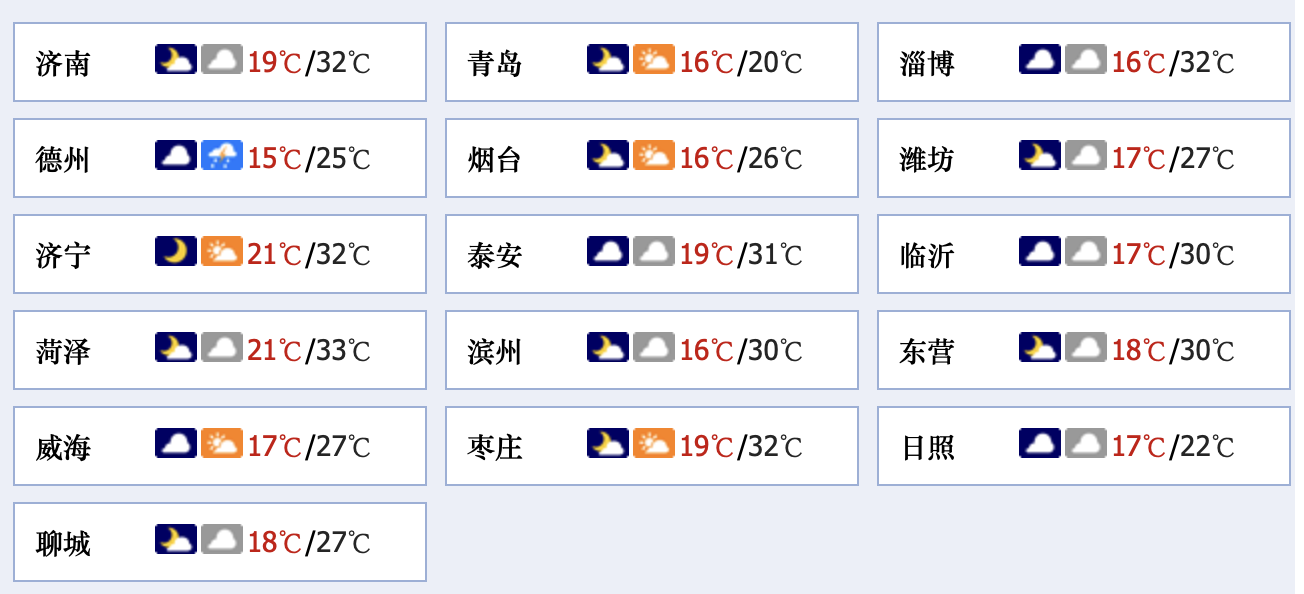 最低气温:菏泽和济宁21℃左右,半岛地区15℃左右,其他地区18℃左右。