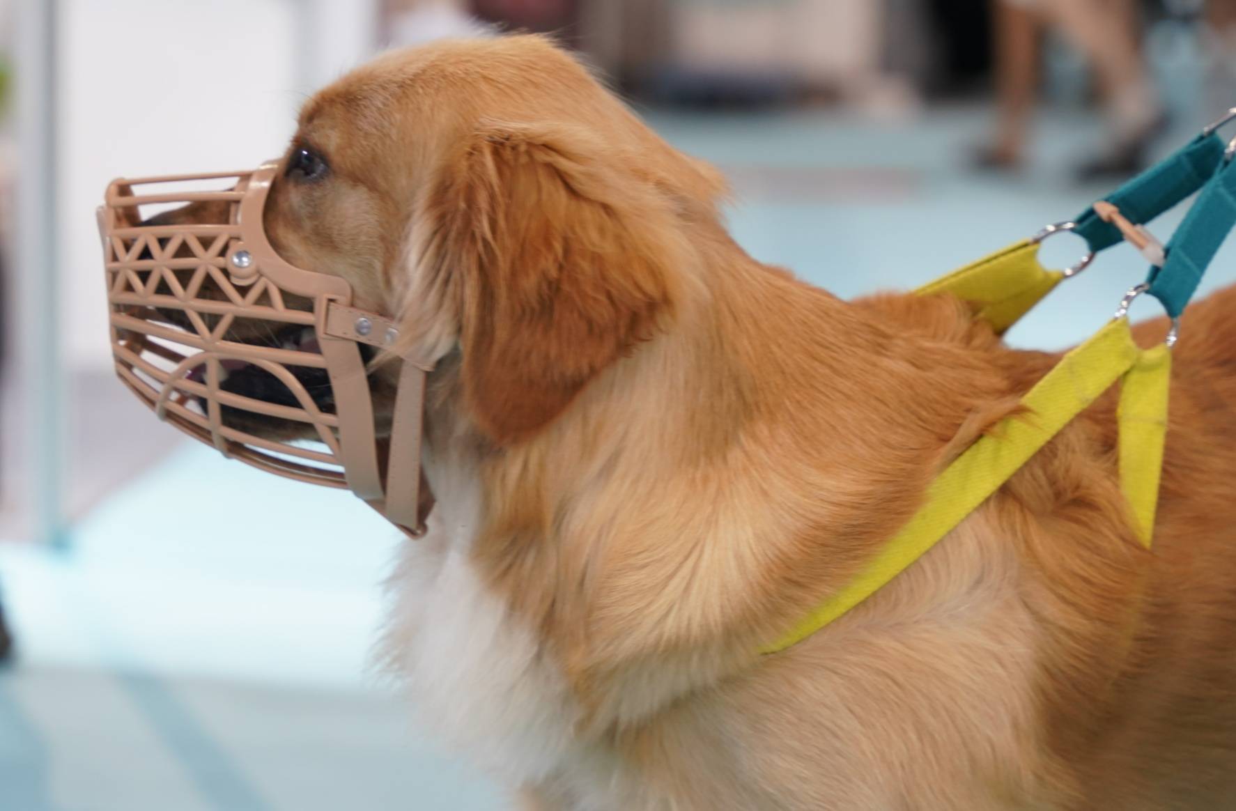 戴着嘴套的金毛在主人的牵引下逛展会(央广网记者 尚天宇 摄)