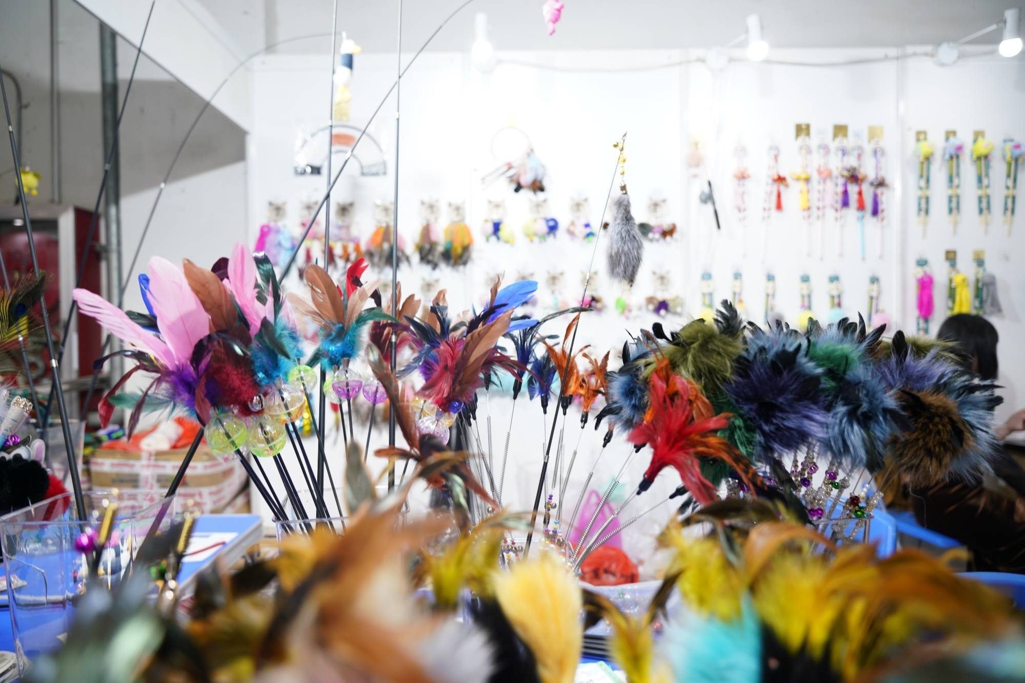 由五颜六色的羽毛制作成的逗猫棒(央广网记者 尚天宇 摄)
