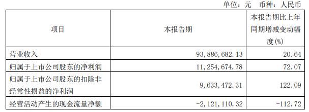 腾景科技2024年第一季度报告显示,2024年第一季度,腾景科技实现营业收入9388.67万元,同比增长20.64%。2024年一季度归属于上市公司股东的净利润1125.47万元,同比增长72.07%。2024年一季度归属于上市公司股东的扣除非经常性损益后的净利润963.35万元,同比增长122.09%。2024年一季度经营活动产生的现金流量净额-212.11万元,同比下滑112.72%。