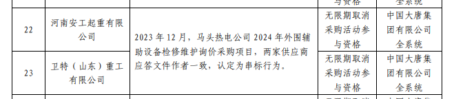 因串标,卫特(山东)重工被大唐集团无限期取消采购活动参与资格