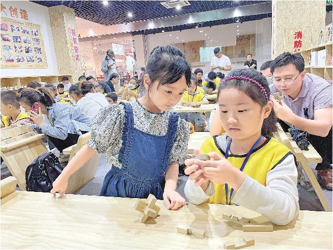 滕州鲁班纪念馆鲁班工坊互动区,小学生们正在体验拆装鲁班锁,领略传统文化魅力。(记者 孟令洋 通讯员 李浩)
