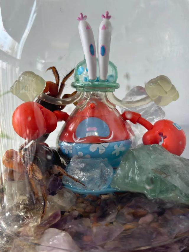 她利用办公室有限的资源,养花剩下的花瓶、朋友送的盲盒、矿洞捡的萤石,给两只小螃蟹搭了一个水陆两栖平台。