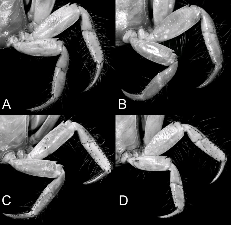 相手蟹的足部刚毛长而挺直,其上还附有与触觉系统相关的凸起结构。即使身处浑浊的泥水中,双眼的视觉不再灵敏,它也能够通过这些“腿毛”感知到周遭环境的微小变化。