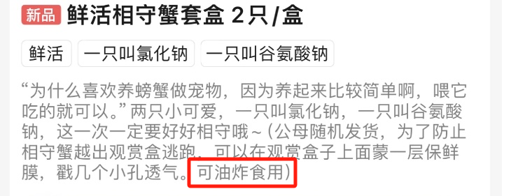 刚上线时,相手蟹还没有确立它作为宠物蟹的地位,被某买菜平台标注“可油炸食用”