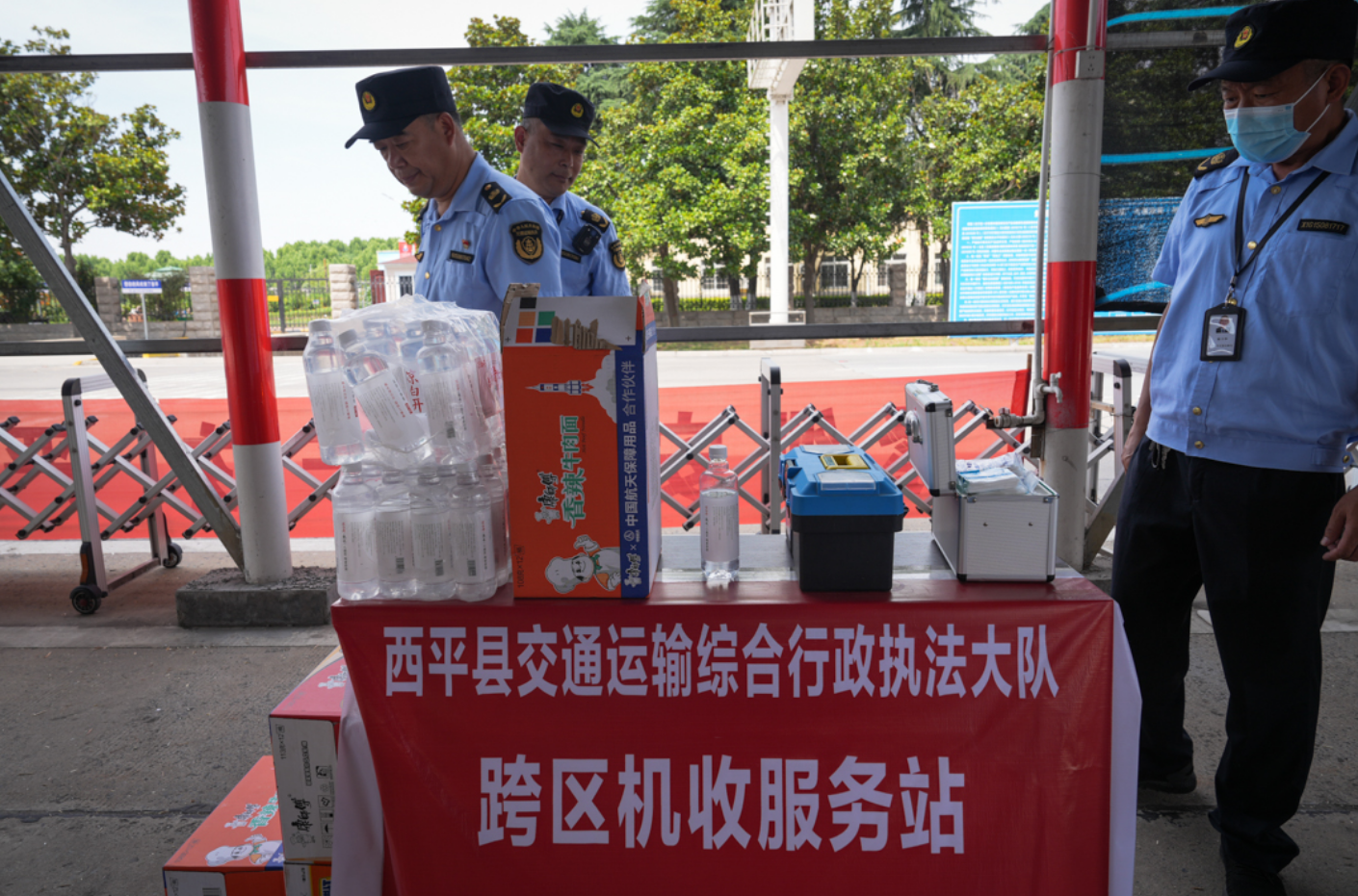 5月28日,在京港澳高速西平收费站记者看到参加跨区机收的农机车辆陆续抵达,现场工作人员对农机车辆“见面即放行”,运输车从“联合收割机插秧机专用通道”有序下站,通过时间压缩至短短的十几秒。站外的便民服务台,西平县交通局、县农业局、高速公路、执法局等多部门联合保障,共同办公,为农机手提供“一站式”服务,内容包括:办理跨区作业证、信息发布、周边路况咨询、机修、临时休息、急救药品、手机充电等便民服务。同时,为农机手免费发放矿泉水、方便面以及防暑爱心礼包等物资,全力以赴为跨区机收车辆做好后勤服务保障工作。