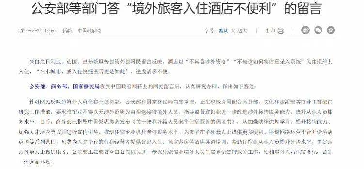 据中国政府网称,针对网民反映的境外人员住宿不便问题,公安部和国家移民管理局高度重视,正在积极协同配合商务部、文旅部等行业主管部门研究工作措施,要求旅馆业不得以无涉外资质为由拒绝接待境外人员,指导监督旅馆业进一步改进涉外接待服务能力,提升从业人员服务水平。