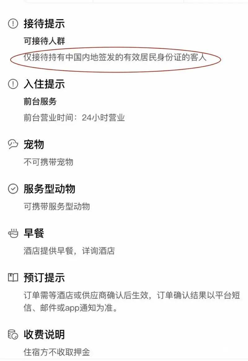 南都记者注意到,目前在各大平台上搜索酒店,酒店会对外披露是否接待外宾信息,如上述自称因缺乏资质而拒绝接待境外人士的酒店就在去哪儿网平台明确显示:仅接待中国内地签发的有效居民身份证的客人。