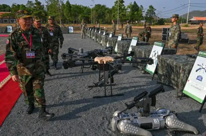 柬军方将领参观机器狗等参演智能装备。图/柬埔寨日报网站