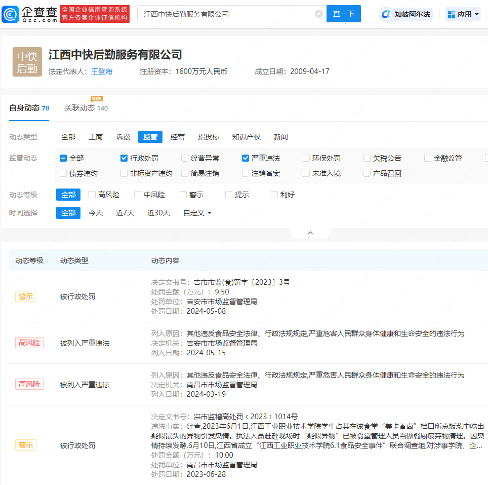 企查查风险信息显示,江西中快后勤服务有限公司及相关责任方此前已被罚款706万元,且公司已被列入严重违法失信企业名单。
