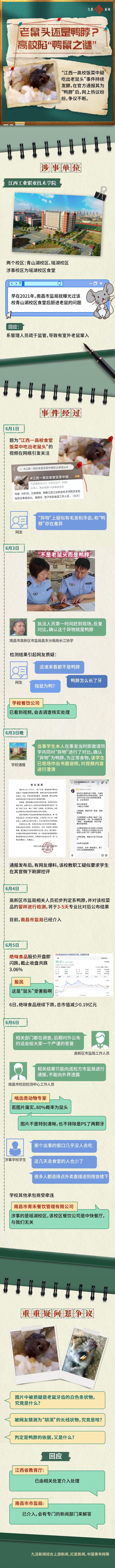 联合调查组经勘查现场,调取监控视频发现,6月1日,学生在食堂吃出疑似为“鼠头”的异物,被涉事食堂工作人员事发当日丢弃。通过查看食堂后厨视频,查阅采购清单,询问涉事食堂负责人、后厨相关当事人、当事学生和现场围观学生等,判定异物不是鸭脖。根据国内权威动物专家对提取的当事学生所拍现场照片和视频进行专业辨识,判定异物为老鼠类啮齿动物的头部。南昌高新区市场监督管理局昌东分局、江西工业职业技术学院未认真调查取证,发布“异物为鸭脖”结论是错误的。