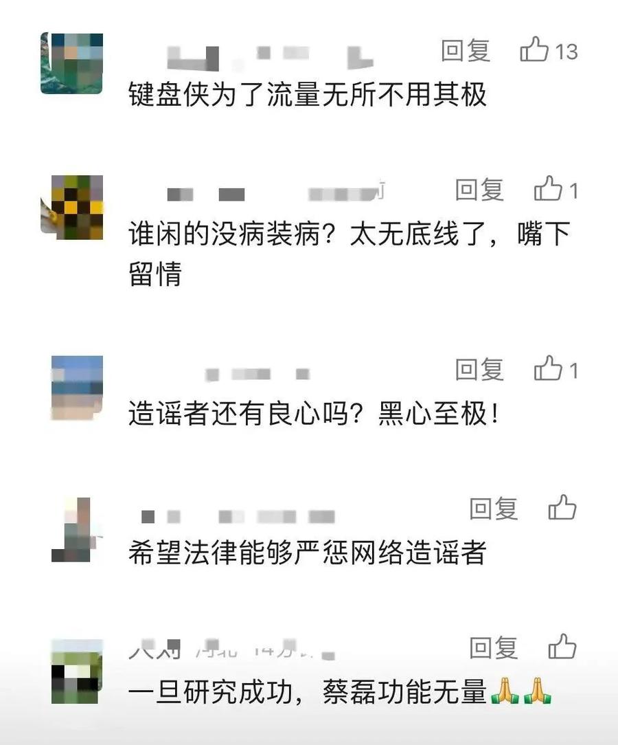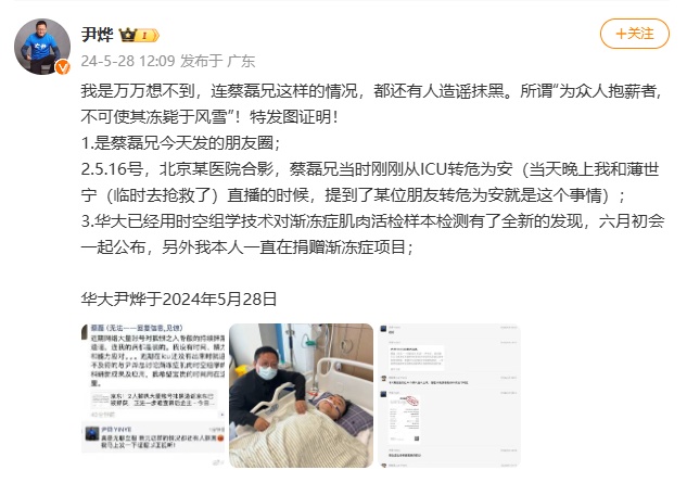 截图中蔡磊表示:“近期网络大量账号对我恨之入骨般的持续抹黑造谣,连我的病都是装的。我没有时间、精力和能力应对。近期在ICU还没有出来时就迫不及待与尹烨总讨论渐冻症肌肉时空组学的科研新成果及应用,我希望宝贵的时间用在这里。”