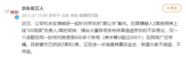 5月27日,据@京东发言人,近日,公安机关反馈破获一起针对京东的“黑公关”案件。犯罪嫌疑人Z某按照其上线“XX视频”负责人J某的安排,操纵大量账号发布抹黑造谣京东的不实言论,仅一个话题在同一时间内就使用600多个账号(其中黄V超过200个)在网络广泛传播。目前警方已抓获Z某和J某,正在进一步追查其幕后金主,希望大家不信谣、不传谣。